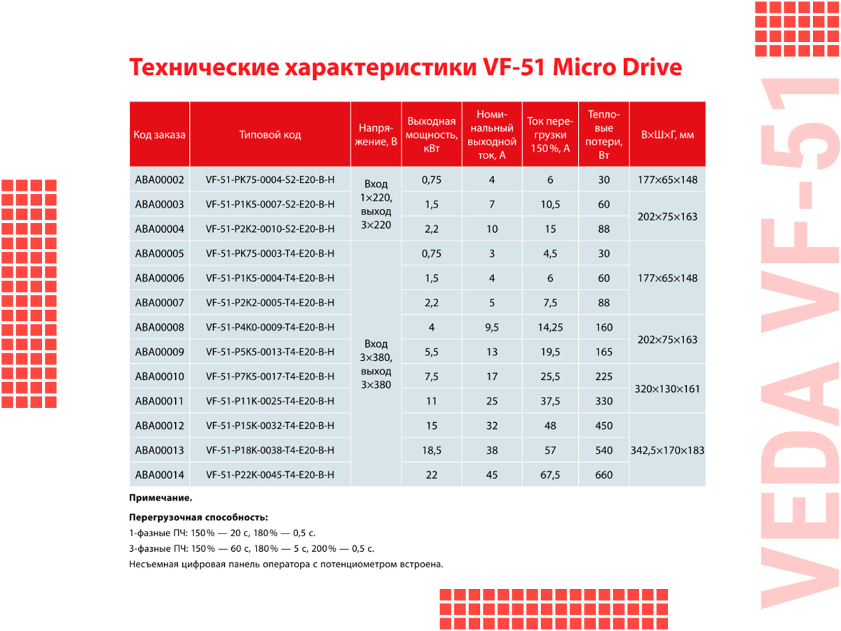 • VEDA cерии VF-51 имеет встроенную цифровую панель оператора с потенциометром на русском языке, что позволяет сэкономить на приобретении пульта и сокращает время на ввод в эксплуатацию.